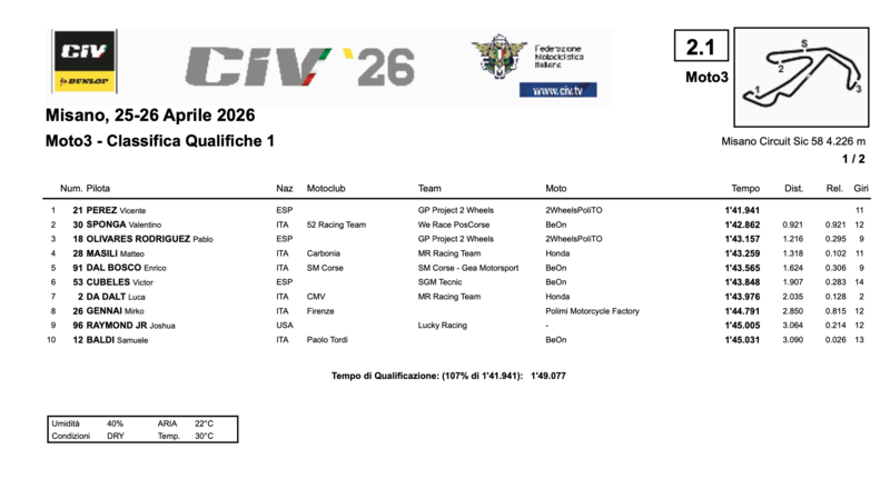 Seconda posizione per Valentino Sponga (We Race PosCorse, BeOn) a 0.921, primo degli italiani e unico pilota in grado di avvicinarsi davvero al ritmo del poleman. Terzo posto per Pablo Olivares Rodriguez (GP Project 2 Wheels, 2WheelsPoliTO) a 1.216 — compagno di squadra di Perez e portatore dello stesso progetto tecnico, a conferma della solidità del pacchetto del team spagnolo. Quarto Matteo Masili (MR Racing Team, Honda) a 1.318, quinto Enrico Dal Bosco (SM Corse – Gea Motorsport, BeOn) nonostante una caduta alla curva 16 nella prima parte di sessione — rientrato autonomamente e capace comunque di portare a casa un crono di valore.