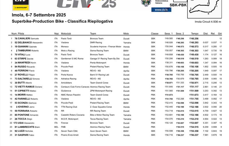 Cominciando dalla classe regina, la Superbike, Alessandro Delbianco sembra intenzionato a voler sfruttare al meglio questo match point. Vuole, cioè, chiudere il discorso titolo proprio qui a Imola, con un round d'anticipo, sfruttando a proprio favore i 71 punti di vantaggio che ha nella classifica piloti. Lo dimostra, tra l'altro, la prima posizione fatta segnare nelle Q1, in cui ha rifilato rispettivamente sette e nove decimi di secondo ai propri inseguitori Samuele Cavalieri e Luca Vitali. Nella Production Bike la lotta a due tra Davide Stirpe e Riccardo Russo, separati da soli 10 punti, si è ripetuta anche nel primo turno cronometrato. I due, nell'ordine, hanno concluso le Q1 divisi da appena quattro decimi. Lo stesso discorso vale per la Supersport. I due principali contendenti al titolo, Luca Ottaviani e Xavier Artigas, hanno conquistato rispettivamente la prima e la terza casella provvisoria in griglia di partenza e solo tre decimi e mezzo li separano.