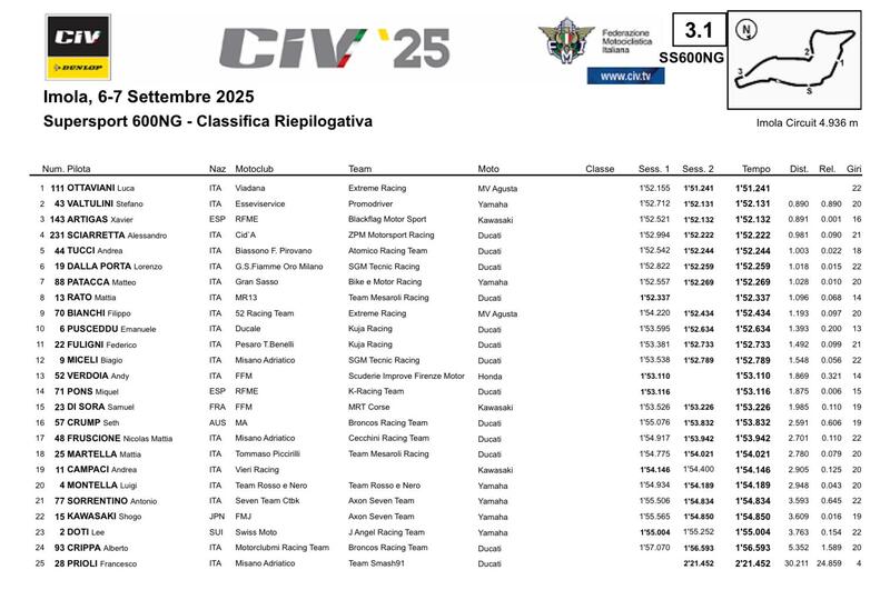 Se Marcos Ruda è il poleman provvisorio in Moto3, con un'opportunità ghiotta di vincere per la seconda volta consecutiva il campionato già qui ad Imola, in Premoto3 è il neo pilota Buccimoto Factory Simone Vianello il primo classificato delle Q1. Non dimentichiamoci che Lorenzo Pritelli è nella stessa situazione dei già citati Delbianco e Ruda, potendosi quindi laureare campione con un round d'anticipo. Per chiudere, in Sportbike è stato il capoclassifica Bruno Ieraci il più rapido della sessione.