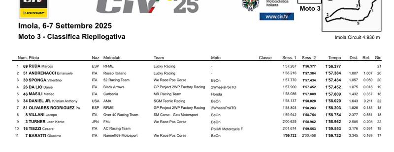 Ruda, che qui ad Imola ha la possibilità di vincere di nuovo il campionato Moto3 con un round d'anticipo, ha preceduto Emanuele Andrenacci, Valentino Sponga e Daniel Da Lio. Il terzetto è racchiuso in appena 68 millesimi. Più staccato Matteo Masili, quinto.