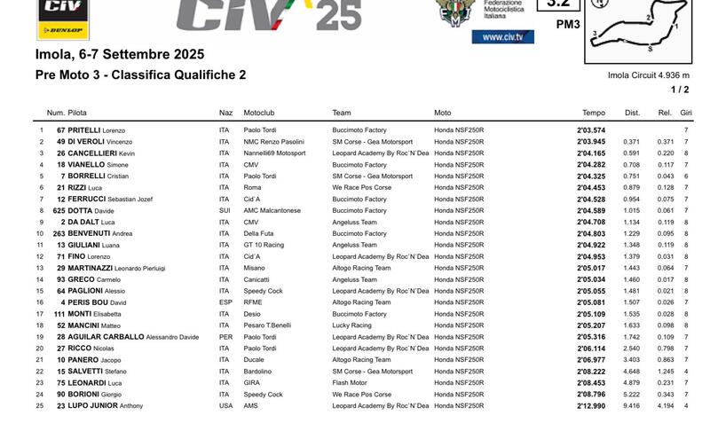 2'03''574 è il tempo che è valso la pole position a Lorenzo Pritelli, il capoclassifica. L'alfiere di Buccimoto Factory è stato più veloce del primo inseguitore, Vincenzo Di Veroli, per quasi quattro decimi. Ricordiamoci che il quindicenne ha qui ad Imola la possiiblità di vincere il titolo di campione italiano con un round di anticipo. La prima fila è completata da Kevin Cancellieri (2'04''165). Quinto tempo per il campione italiano 2024 Cristian Borrelli, che compete qui in veste di wild card.