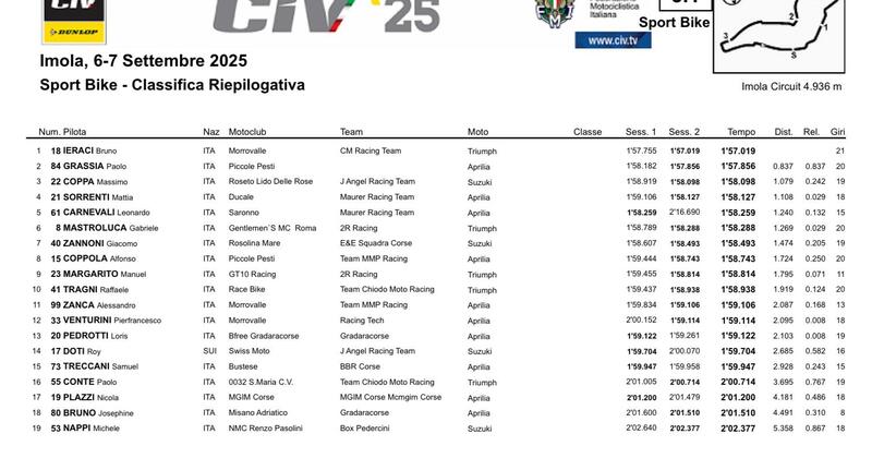 Imola - Comincia il sabato del quinto round del Campionato Italiano Velocità 2025, giornata in cui si disputano le Qualifiche 2 in mattinata e Gara1 di tutte e cinque le categorie al pomeriggio, a partire dalle ore 13.25. Saranno Superbike e Production Bike ad inaugurare il programma di gare.