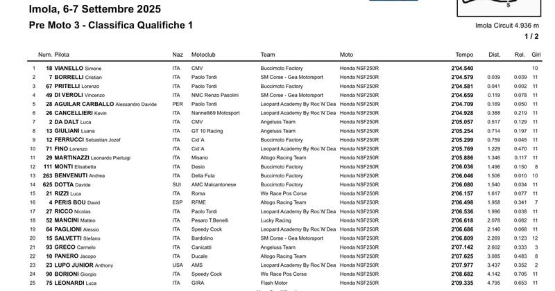Simone Vianello! Conclusa la propria avventura con il team Smcorse e Gea Motorsport, il neo pilota di Buccimoto Factory è risultato essere il più veloce nelle Q1 in 2'04''540, precedendo di appena 39 millesimi il campione di categoria 2024 Cristian Borrelli (wild card in questo round). Il leader di classifica Lorenzo Pritelli conquista il terzo posto provvisorio, ad appena due millesimi dalla seconda posizione. Vi ricordiamo che il quindicenne sta affrontando questo round forte di 53 punti di vantaggio sul secondo, Alessandro Aguilar Carballo, e ha quindi il primo match point per vincere il campionato 2025.