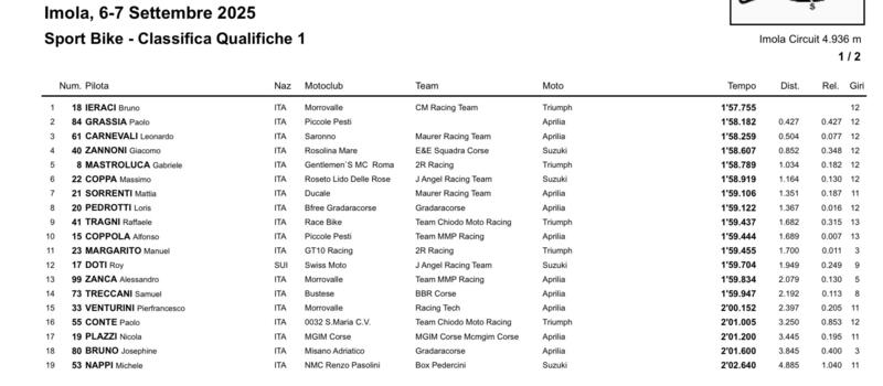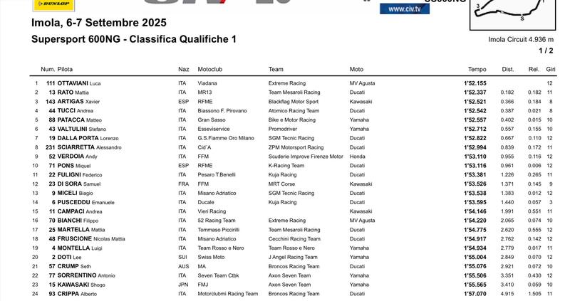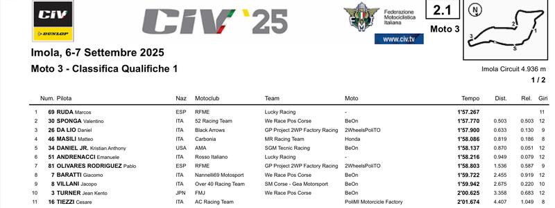 Il campione in carica e leader di classifica Marcos Ruda si impone con il tempo di 1'57''267, staccando di cinque decimi di secondo il primo inseguitore Valentino Sponga. Con Elia Bartolini, il secondo nella classifica generale, che è assente perchè impegnato nel WorldSSP300 a Magny-Cours, pensiamo che lo spagnolo abbia buone possibilità di laurearsi campione già qui ad Imola. La terza posizione provvisoria è di Daniel Da Lio, l'ultimo dei piloti che sono riusciti a siglare un riferimento cronometrico inferiore al minuto e cinquantotto (1'57''900).