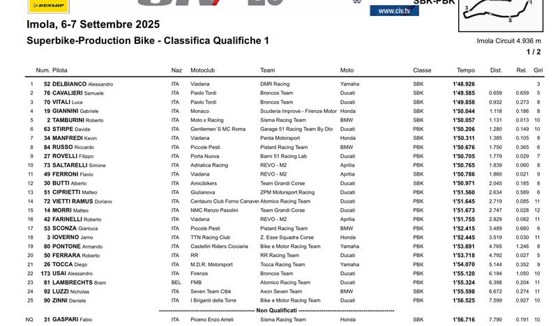 Il miglior tempo nella Production Bike appartiene invece a Davide Stirpe (1'50''381), che ha preceduto Riccardo Russo (1'50"748) e Simone Saltarelli #73 (1'50''983). In SS a guardare i propri avversari dall'alto, con un vantaggio di tre decimi, c'è il leader di classifica Luca Ottaviani, in 1'52''189, davanti a Mattia Rato ed a Matteo Patacca.