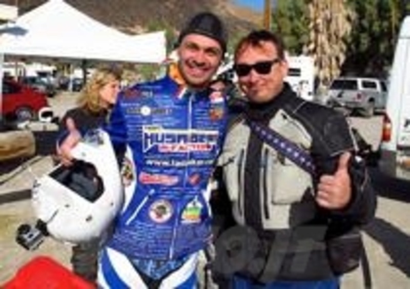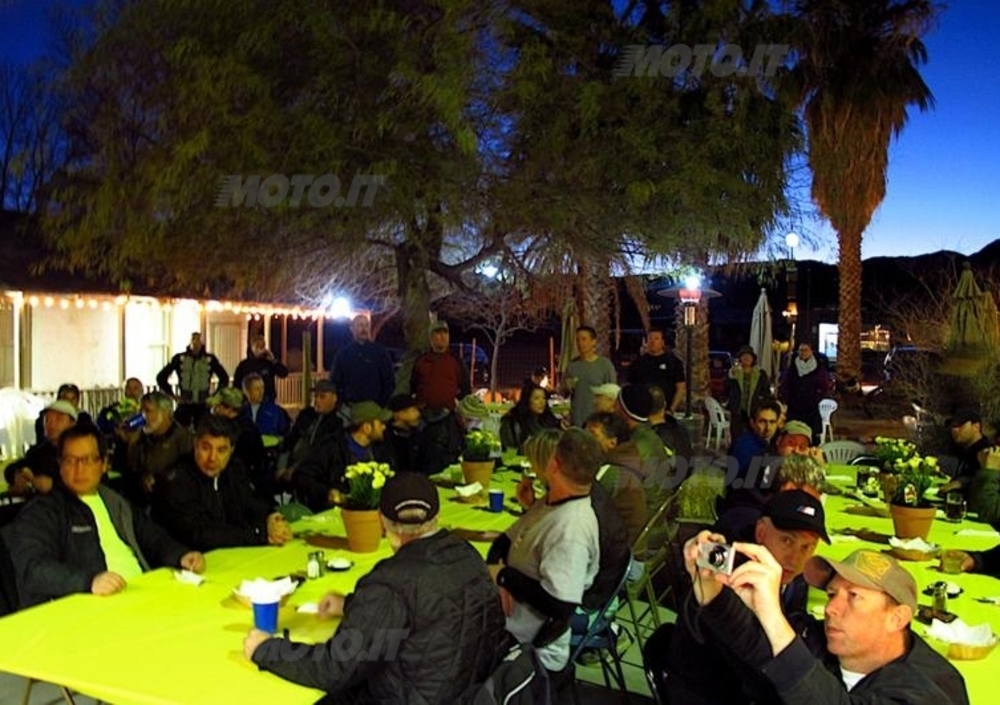 Spesso ci siamo anche fermati a scattare foto, in particolare quando siamo arrivati sulle dune. La cosa fantastica del deserto del Nevada non è solo il paesaggio che si può ammirare, ma la vasta tipologia di terreno che cambia radicalmente in uno spazio ristretto. Con i nostri motoroni abbiamo iniziato a driftare su queste stupende dune bianche, che fortunatamente avevano una notevole consistenza permettendoci di scalare anche le più alte senza particolari insabbiamenti. Dopo molte ore in sella siamo rientrati, al calare del sole, al bivacco, esausti ma felicissimi. Tutti hanno radunato tutte le loro cose, preparato le valige e ci siamo diretti al Craw Bar dove all’aperto abbiamo cenato di nuovo tutti assieme e dove io e Jimmy abbiamo raccontato le nostre storie dakariane su un palco con tanto di video e immagini.