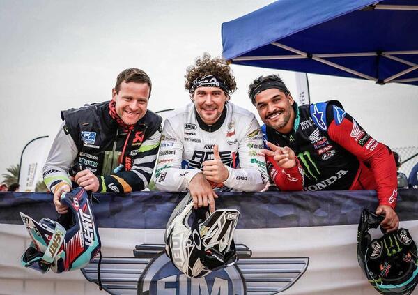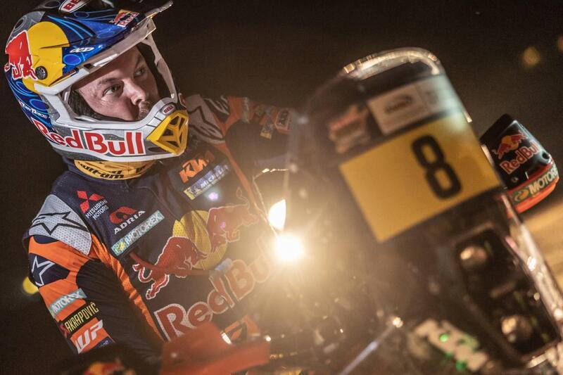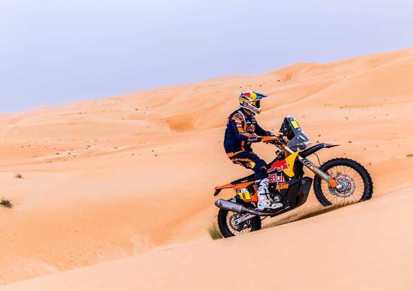 Dalle Moto, come sempre, cioè in ordine di uscita dal bivacco. Apre la pista Luciano Benavides, Husqvarna, il vincitore della seconda tappa, ed è ben presto confronto teta a testa tra l’ex leader Pablo Quintanilla, Honda, e Toby Price, KTM, sotto la stretta sorveglianza di Adrien Van Beveren, Honda, il leader dell’Abu Dhabi Desert Challenge numero 33 alla vigilia. Partito dalla nona posizione, Quintanilla passa ben presto al comando della Speciale e, praticamente a vista, Toby Price tallona il cileno. Alla movida della Tappa partecipano attivamente anche “Nacho” Cornejo e Skyler Howes, partiti tra i primi. Al rifornimento, grazie ai bonus apripista, Cornejo passa virtualmente a condurre, ma nel finale Quintanilla riprende la testa della corsa e va a vincere davanti a Price e Howes, con un vantaggio che lo riporterebbe al comando della generale provvisoria, ma…