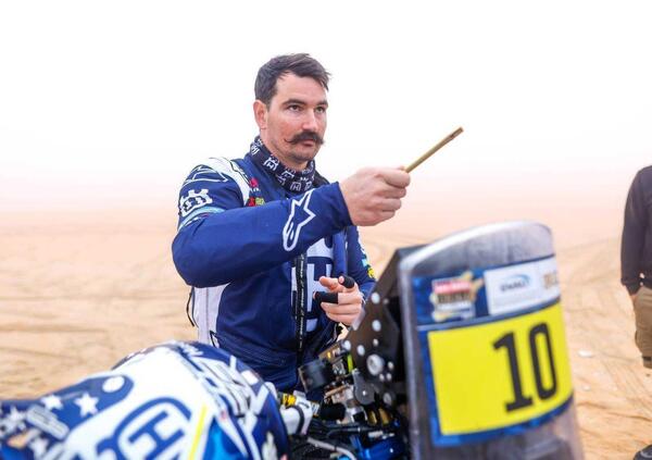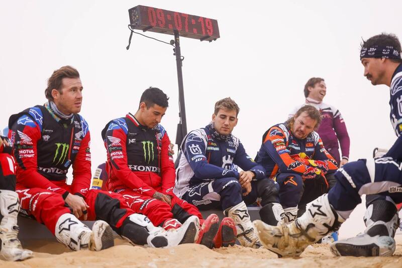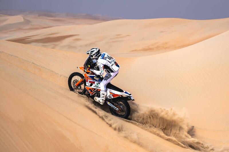 Apripista Toby Price, praticamente uno “scrittore” di tracce sulla sabbia levigata dalla nebbia, per piacere e vantaggio degli avversari. Poi c’è la svelta risalita di Quintanilla, che si unisce al battistrada cercando di alzare il ritmo. La sua Moto si arrenderà a cinquanta chilometri dall’arrivo. Difficile aprire, si perde sempre del tempo e, nonostante i Bonus Apripista, dalle retrovie risalgono quelli partiti indietro, in particolare Luciano Benavides, Husqvarna, che è diventato uno “specialista”.