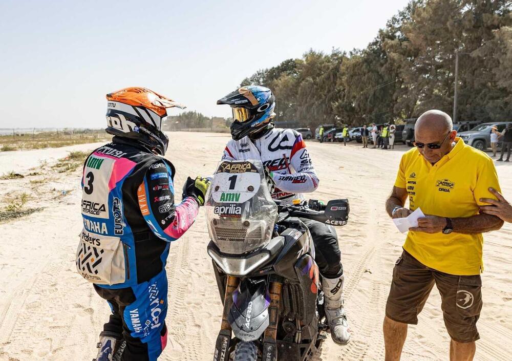 Alternanza perfetta al comando fino a Benichab, sesta tappa, 3 a 3 tra Aprilia e Yamaha, poi Botturi va in testa fino alla 10ma, l’ormai famosa tappa che si conclude con i due Piloti separati da appena 9 secondi, preludio alla sfida dell’undicesima da cardiopalmo. Cerutti e Botturi bravissimi ma a tratti anche vittime di circostanze cruciali. Botturi corre fino a Dakhla con la febbre alta, Cerutti va KO per un virus intestinale durante l’ottava, il primo anello di Amodjar. Anche “meccanicamente” c’è un pareggio di circostanze perverse. Cerutti finisce sul cerchio la sesta tappa che porta a Benichab, esplosione della mousse, Botturi acquisisce un margine importante, Botturi rimane bloccato da un telo di plastica incastrato nelle ruote nella 11ma a Mpal, e Ceruti vince il Rally.