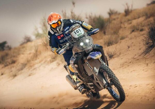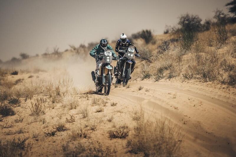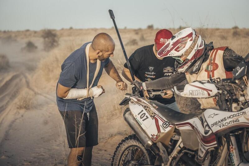 Le Moto, i loro Piloti, e il camion di Verzeletti-Fortuna con il cambio rotto da trainare. Lavoro per gli scampati. Giù a sbadilare per liberare le ruote dalla morsa della sabbia. Le vesciche alle mani abituate a manciate di gas ma non a spalare. Poi si rompe anche il camion scopa. L’equipaggio scende, smonta, salda, rimonta. La zattera di salvataggio riparte. Botturi e i compagni di sventura sono arrivati a Ouad Naga di notte, stremati, e da lì è partita la corsa dei meccanici. La Ténéré 700 #101 aveva il carter squarciato. La cruna guida catena si è piegata contro un sasso, la catena è saltata tra il pignone e l’alluminio della carcassa e il motore è esploso, come era “giusto” dopo tanta sollecitazione. Il motore è cambiato sottraendo alla notte preziose ore di sonno. Botturi non aveva troppa voglia, ma quando i suoi meccanici gli hanno riconsegnato l’arma, come nuova, ha sentito la scarica di adrenalina e la responsabilità di quella passione che accomuna. E si è lanciato in Speciale.