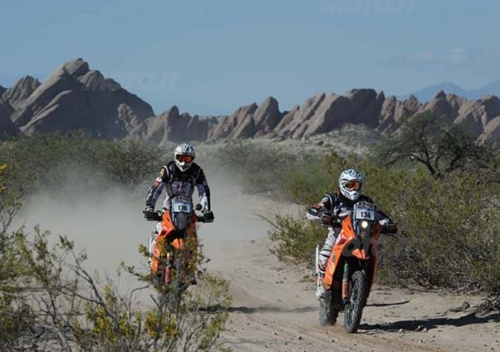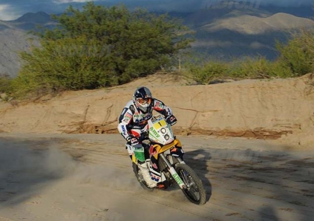 Più coerente con lo spirito dell’imprevedibile Dakar è, invece, lo sviluppo della 3° tappa, con un inizio a suon di tensioni da colpi di scena, per fortuna per la maggior parte ridimensionati. Despres attacca la Speciale di 521 chilometri, ma poco più avanti commette un errore, per fortuna piccolo, di navigazione, ed al primo waypoint ferma la “sveglia” con un ritardo di sei minuti e mezzo dalla testa della corsa, in quel momento comandata dall’americano Street. Poi riparte all’attacco e comincia a recuperare, ancora una volta imponendosi un cambio drastico di strategie. Nel frattempo l’azione di Marc Coma si fa imponente e, come accade spesso allo spagnolo, il suo “allungo” è irresistibile. Al secondo CP di giornata, prima della neutralizzazione di una speciale che ha cambiato volto e terreno più volte, lo spagnolo è solo al comando. 250 km di speciale alle spalle, quando i concorrenti si riforniscono ed entrano nei 170 km di tratto neutralizzato, Despres ha recuperato metà dello svantaggio iniziale, ed è ora a poco più di tre minuti dal catalano. Tra i due ufficiali KTM si sono inseriti il portoghese Paulo Gonçalves (BMW) ed il francese Olivier Pain (Yamaha), autori di una magnifica Speciale. Lopez (Aprilia) accusa oltre 12 minuti di ritardo. Fiato sospeso, fino alla ripresa della Speciale, che diventa incandescente.