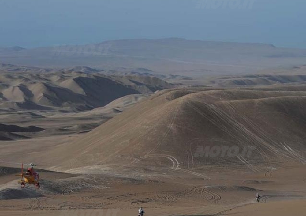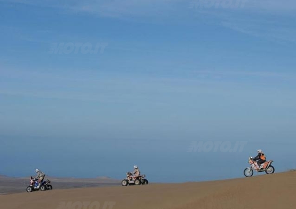 Protagonisti della giornata sono Francisco Lopez e, soprattutto, Helder Rodrigues, che si sono sobbarcati gran parte del lavoro di “apripista” di una speciale lunga, difficile e molto faticosa. Il caldo e la polvere fine come talco hanno allungato la fila delle sofferenze a cui si sottopongono volentieri i Campioni della Dakar. Lopez, che partiva in seconda posizione da Iquique, si è incaricato della navigazione nella prima parte della Speciale, ma Rodrigues lo ha ben presto raggiunto ed ha poi condotto, rassicurato dalla “competenza territoriale” dell’avversario, fino all’arrivo. Rodrigues è stato anche virtualmente in testa dal 300° chilometro sin quasi alla fine quando, per la correzione dei tempi, leader definitivo della tappa è diventato Ruben Faria.