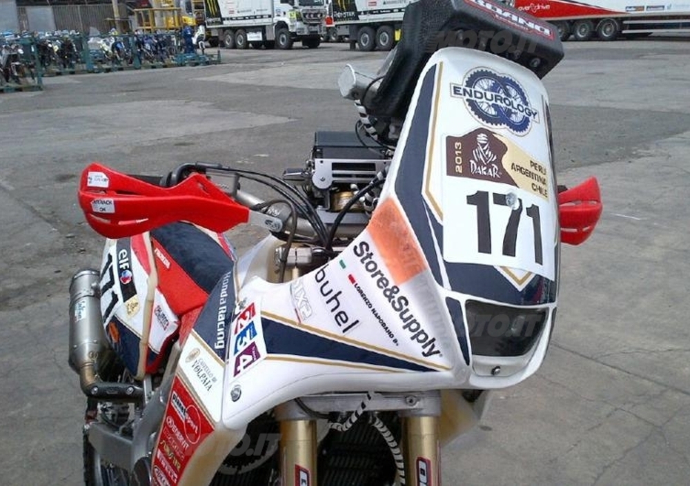 Arriviamo alla stazione dei pettorali di gara, quelli da attaccare alle giacche. C’è un omone che tento subito di farmi amico rinominandolo le nouveau valentino'. Lui abbocca e gli appioppo le 6 giacche del team da “clippare”. Mezz’ora abbondante di lavoro. Passiamo ai controlli del motore. Robi usa tutta la sua maestria e riesce a farci stare dentro la classe marathon (le moto di serie). Si provano luci, si controlla l'acqua portabile di sicurezza nel paramotore... …azzo, dov’è? Se n'è andata, il paramotore-serbatoio in kevlar perde.