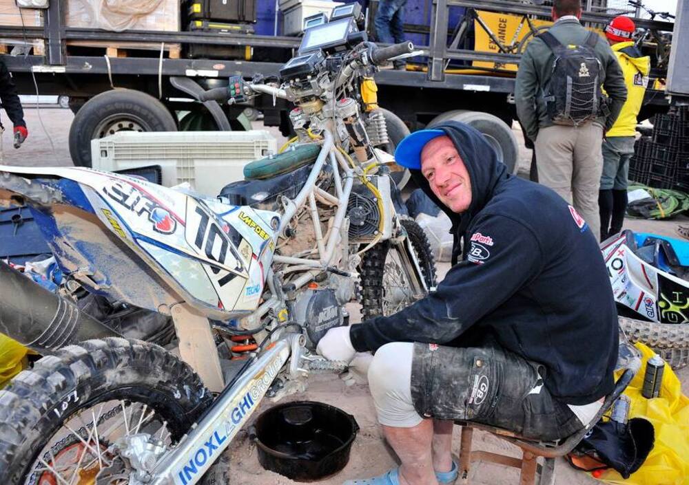 «Il secondo giorno, sicuro, lo è stato per tutti, ma io ci ho messo il carico da undici. Si è crepato il barilotto del filtro esterno dell’olio, e mi dovevo fermare ogni venti, trenta chilometri, smontare tutto e rabboccare con olio di ogni tipo, tutto quello che riuscivo a trovare. In più il caldo asfissiante e il fesh-fesh. Massacrante. Mi sono visto oltre il limite del fuori tempo massimo. Il giorno dopo idem: prima la frizione da riparare e poi, a causa della fretta, il pignone perso nel deserto. Dovevo ritrovarlo, non avevo altra scelta né alternativa, ci ho messo più di un’ora e l’ho ritrovato, ma sono stato vicinissimo ad alzare bandiera bianca. Ma non poteva essere così due anni di fila, guai, e ho tenuto duro. Poi i momenti difficili di tutti, come i giorni in Bolivia. Io avevo anche rotto il manubrio, ma fare tutta la tappa sotto l’acqua, e ripartire la mattina dopo con gli indumenti fradici e cinque gradi scarsi là fuori… è stata dura».