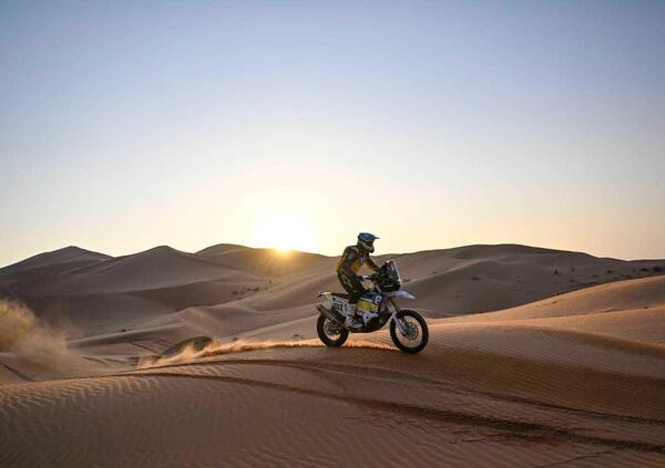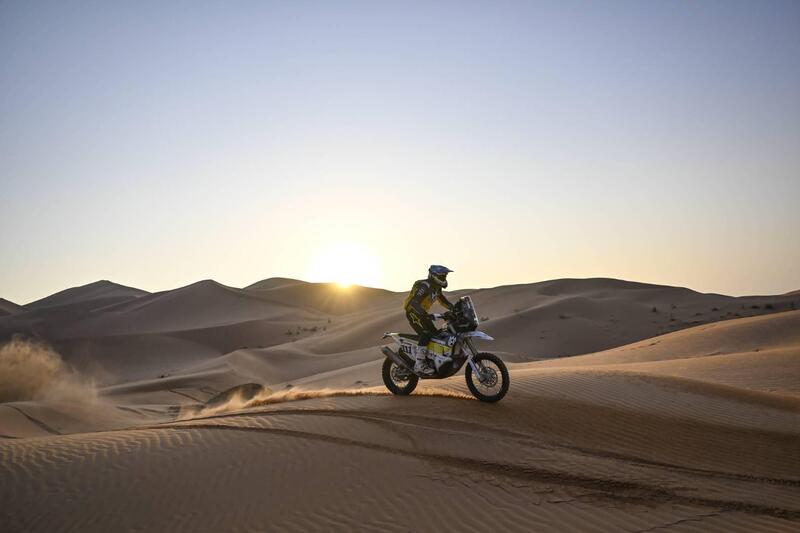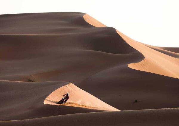 Plateau e cordoni di dune, chott e dune, piattoni e dune. Una sequenza ripetuta varie volte nell’alternare il gas a fondo per andare veloci e per “scollinare”, per non rimanere intrappolati. Cee lo ha detto subito Paolo Lucci, il più forte dei nostri e forte, sempre più forte, davvero, che si è divertito a correre quasi tutta la Tappa insieme a Ross Branch. Oltre una di quelle creste Paolo ha trovato una duna tagliata, e il cuore gli è andato in gola, poi ha controllato, si è lasciato scivolare e via, avanti un’altra. Paolo Lucci, 19° al ritorno al bivacco “infame” di Shayba, ormai viaggia nel plotone di quelli che “si divertono”. Bella cosa saper andare in Moto così. Brutta cosa, a proposito vi aggiorniamo, se la Moto si pianta ed è finita lì, come è successo a Eufrasio Anghileri dato fermo all’ingresso dell’Empty Quarter due giorni fa. Anghileri è a Shayba, oggi deciderà cosa fare.