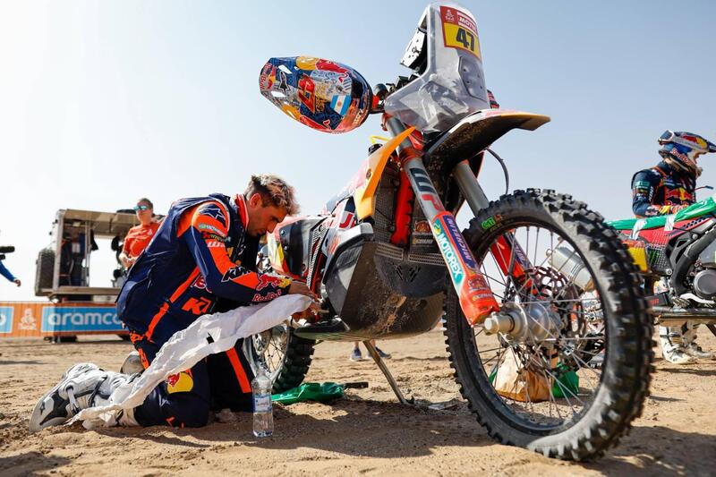 A Empty Quarter la situazione è diversa. Intanto il contesto di terreno è caratteristico e il grande ordine aiuta a semplificare. Poi i concorrenti sono arrivati presto, vi hanno trovato gli effetti personali trasportati dagli organizzatori, materassino, tenda, sacchi a pelo, e hanno avuto tutto il tempo di fare i propri tagliandi o di aiutarsi tra loro per risolvere un eventuale problema. Ricordate quella volta che Price dovette ricucire di fascette e corde quel che restava di pneumatico e mousse? No, quest’anno nessuno dovrebbe aver accusato problemi di gomme, comunque punzonate a Shaybah, e gli impatti non possono essere stati cruciali, è stata una Speciale di sabbia e le temperature non sono mai state troppo alte. Quindi il lavoro si limita a qualche controllo programmato e i ricambi a leve, pastiglie, un iniettore. Un big team può spalmare tra i suoi uomini qualche pezzo in più, ma mai certamente un parafango o un manubrio. Il punto cruciale della formula Marathon è l’accesso dei camion T5, che sono realmente in gara e… realmente assistenza. Ovvero sarebbero il cavallo di Troia ideale per una Marathon. Niente paura, il loro raggio d’azione è drasticamente limitato da una regola semplice, il tempo che ciascun concorrente può dedicare alla manutenzione: mezz’ora per i RallyGP, un’ora per gli altri! Se tutto è organizzato così bene perché non si dovrebbe vedere l’ora di andarsene? Per quella pastasciutta tra amici della sera successiva.