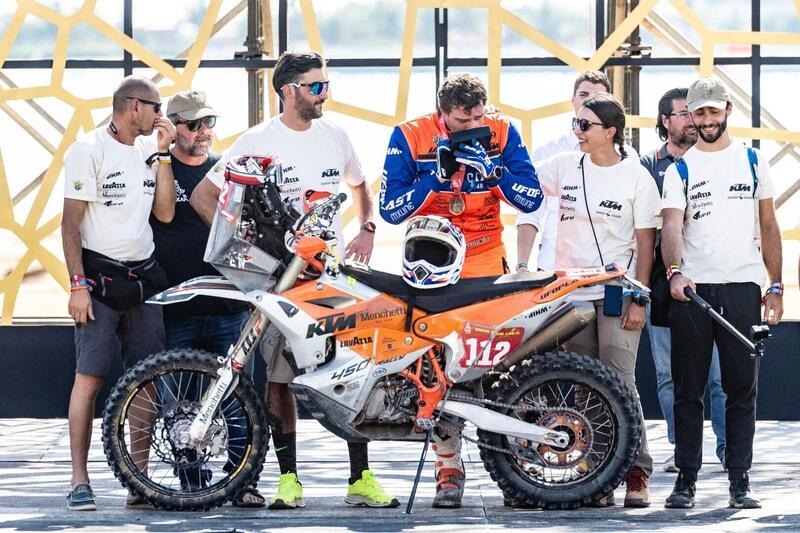 GM. “È così, mi sentivo bene, ero contento. Mi sono goduto ogni sveglia, ogni partenza, ogni momento. Non mi sono mai sentito dirmi “chi me lo ha fatto fare?”, e man mano che arrivava la sabbia mi sentivo ancora meglio. Bella la tappa corta tutta di sabbia, bellissima la 48H Chrono. Bellissima la tappa Marathon in quel contesto, ritrovarsi seduti per terra attorno al fuoco bravi e meno bravi, “big” e amatori come me. Niente camper, niente comodità esclusive, tutti uguali, tutti la stessa razione alimentare di “emergenza”, tutti a armi pari, tutti con gli stessi “lavori” da fare alla Moto e tutti con le stesse condizioni e gli stessi tempi a disposizione. Me la sono proprio goduta!”