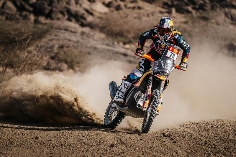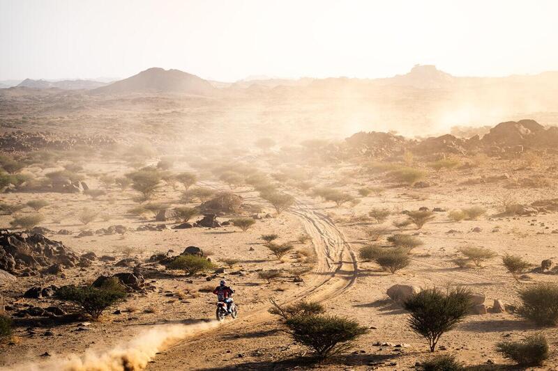 La Dakar delle Moto ha perso subito Noah, Sherco, e Buhler, Hero Motorsport, vittime di cadute. Sono le prime “vittime” della 47ma edizione. Skyler Howes si è fermato a soccorrere il tedesco e vedrà restituito il tempo della sosta di aiuto. Ed entriamo nella prima Tappa. Bisha-Bisha, ad anello come abbiam detto, 86 Chilometri di trasferimento e 413 di prova speciale. Sulla superficie veloce del Deserto disseminato di sassi Ignacio “Nacho” Cornejo, Hero Motorsport, apre la pista e mantiene il comando della navigazione per l’intera Speciale. Il cileno è un asso con road book e gps, ma evidentemente la navigazione non era così difficile. Aprire la pista per 413 KM significa per “Nacho” un bonus di tempo, circa 5 minuti e mezzo, da sottrarre al tempo totale cronometrato.