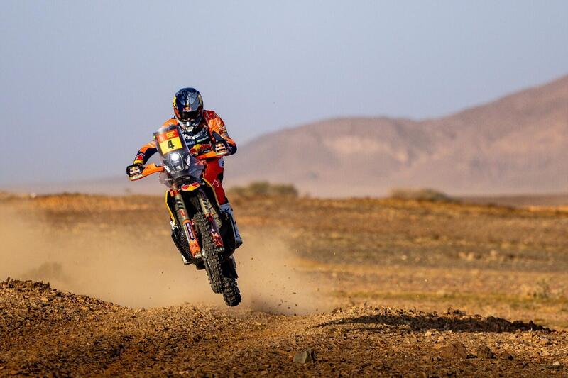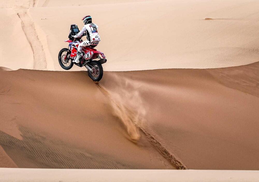 Sanders parte deciso, come ormai ci ha abituato in questa edizione di Dakar, ma la navigazione è tutt’altro che scontata. Piccoli errori, rallentamenti, sta di fatto che al chilometro 122 della prova speciale l’australiano è raggiunto dai diretti inseguitori, Edgar Canet, KTM, e Tosha Schareina, Honda. Da quel momento in poi i tre Piloti corrono e navigano a vista e a distanza ravvicinata, e condividono i Bonus Apripista. Canet non è riuscito a “distrarre” Schareina, mediamente più veloce e reattivo, e quindi a Schareina è venuto facile recuperare i sei minuti del differenziale alla partenza. Al KM 133 incidente per Pablo Quintanilla. Il Cileno ufficiale Honda, due volte Campione del Mondo Rally-Raid, cade rovinosamente e viene soccorso da Luciano Benavides e Adrien Van Beveren. Sale poi da solo in elicottero, ma con una forte contusione alla spalla che richiede accertamenti. Ai piloti che lo hanno assistito verrà restituito il tempo dello stop, per lo squadrone Honda Monster, che aveva i cinque piloti nei dieci, è il primo ritiro in questa edizione. Sanders alza il ritmo e riprende ad aprire la pista. Al traguardo avrà limitato grandemente i danni.