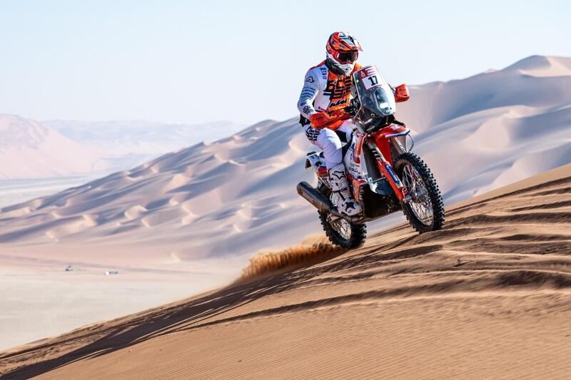 Non sono stati i 500 chilometri di dune il giudice supremo della gara delle Moto. Anzi. È stata una due giorni che oggi produce in raffinato, inedito e fantastico equilibrio. La Tappa ha messo in risalto le doti di “surfista delle sabbia” di Adrien Van Beveren, il francese neo acquisto Honda che ha vinto la Speciale e la Tappa, ma la buona operazione è quella del compagno di Squadra Ricky Brabec, terzo alle spalle di VBA e Toby Price già vincitore della Dakar 2020, la prima disputata in Arabia Saudita. L’americano è, infatti, da oggi il nuovo leader della Corsa. I giochi, tuttavia, sono tutt’altro che fatti. Ross Branch che era entrato nella 48H Chrono da leader, ne esce battuto ma non umiliato. Quinto al traguardo di ritorno di Shubaitah, l’ufficiale Hero resta perfettamente in corsa ad appena 51 secondi dal nuovo leader. Per la Factory indiana è una condizione inedita, e la conferma della “sospettata” competitività della 450 Rally sviluppata dal Team di Wolfgang Fischer. Non è neanche questa, invece, la Dakar di Joan Barreda, passato proprio alla vigilia tra le file di Hero. Lo spagnolo, apripista per tutto il giorno precedente, si è fermato per un problema meccanico e, constatatane la gravità, ha alzato bandiera bianca