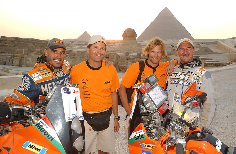 La cena diventa anche un evento pratico. Diamo una mano a Paolo Lucci. Facciamo qualcosa anche noi perché realizzi il suo sogno. È bravo? Sì, ma lo dovrà dimostrare. È appassionato? Ce lo dirà dopo aver sputato sangue, e allora non faticheremo a crederlo. È un Campione? Che prima vinca! Ma se restano tutti discorsi, allora siamo solo e tutti delle belle teste di cavolo. Federico ci salva e fa la prima mossa. La cena si paga, e l’incasso si devolve, intero, alla “causa”. Raccoglie quasi duemila euro. Esattamente la cifra necessaria per iscriversi al Panafrica Rally di settembre, rito di passaggio necessario per avvicinare la grande sfida. Che non si sa ancora cosa sarà. Dipende dal budget e dalle opportunità, molto anche dalla scelta giusta. La Dakar è il fine, ma forse sarebbe più intelligente e progressivamente più utile passare per l’Africa Eco Race, tra l’altro più aderente allo spirito della Dakar originale vinta due volte sul Lago Rosa da Fabrizio Meoni. Nel 2001 per la prima volta di KTM con la monocilindrica LC4 Rally, nel 2002 per la prima volta di KTM con la bicilindrica LC8.
