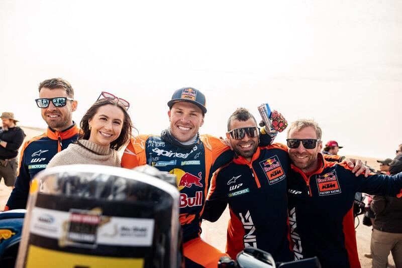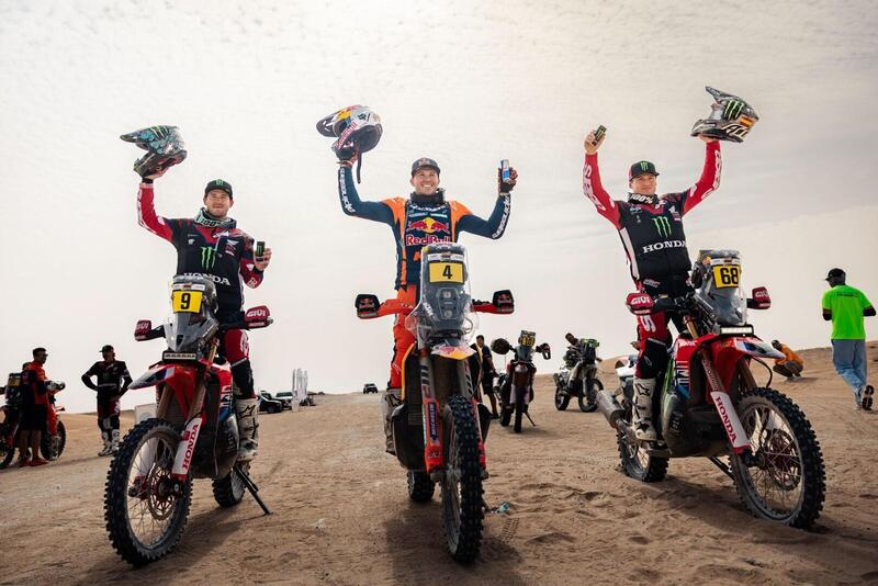 Ultima Tappa. È tradizionalmente più breve, appena 160 chilometri di speciale per rientrare nella Capitale dell’Emirato. Poco da fare per quanto riguarda la gara delle Moto, se non tenersi alla larga dagli imprevisti, e invece thriller assoluto tra le Auto con il duello all’ultimo chilometro tra Al Attiyah, Dacia, e Lucas Moraes, Toyota. Sanders non ha difficoltà a mantenere il ritmo di sicurezza che gli garantisce di conservare buona parte del vantaggio, e vincerà il Rally, Schareina attacca a fondo, vince l’ultima Speciale e recupera qualcosa, ma non abbastanza, neanche per raggiungere Ricky Brabec che chiude la corsa al secondo posto. Due Honda sul podio finale di Abu Dhabi, ma sul primo gradino ancora una KTM, ora Squadra risparmiosa ma efficientissima, negli Emirati diretta da Stephan Huber. È il momento magico, ormai lungo, di Daniel Sanders, in evidente stato di grazia. Da Ottobre, Rally del Marocco, ha vinto tutto, tre prove di Mondiale di fila, Dakar compresa, naturalmente. Per la cronaca gli italiani: Riva 17°, Guerrini 29°.