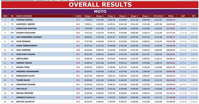 Sta di fatto che Thomas Marini ha vinto il primo Rally internazionale a cui ha partecipato. In principio il programma prevedeva, dopo il podio (di giornata) al felice Sardegna Rally Raid, di passare dall’Isola alla Tunisia per uno stage di formazione. Resasi conto delle temperature delle oasi africane in questo periodo (non ci voleva un genio della meteorologia…), la Squadra ha deciso di soprassedere e di lanciare il Pilota direttamente nella fossa dei leoni della competizione balcanica. Scelta vincente, in ogni caso, che ha condotto il Marini Pilota Rookie alla vittoria di Tirana dopo essersi messo dietro Ludovico Tiziano Brezzi, quindi non solo figlio d’arte non solo terza generazione della premiata realtà del tartufo e non solo in Maremma, e Christian Pastori, per quel podio che abbiamo impacchettato, forse con un tantino di fretta nazionalista, come tutto italiano. Figlia dell’euforia del luppolo, invece, da Tirana la proposta di legge di portare da tre a cinque i posti sul podio, in modo da farvi salire il poker azzurro completato da Gianni Stigliano, e il primo straniero 100%, Jan Vonsadrek detto Honza. Brezzi, secondo assoluto e vincitore della M2, in definitiva diventa il faro della formazione MD che comprendeva anche Francesco Olivo, Nicolò Mari, Alberto Carlini.