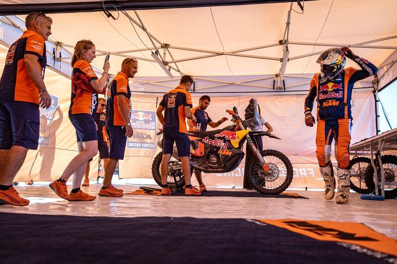 La gara delle Moto non ha avuto storia. O meglio, ha avuto la storia dei Rally-Raid di quest’anno, profondamente modificata dal Daniel Sanders 2.0, “creatura robotica” straordinaria sviluppata da Jordi Viladoms & Co. nei laboratori segreti di KTM. La storia è semplice e terrificante allo stesso tempo. La prima era del Rally-Raid si basava sull’astuzia e sugli istinti di sopravvivenza e di navigazione, aspettando che arrivasse il momento buono per la fortuna o l’a fondo. La seconda fase è stata incentrata sulla performance di astronavi inarrivabili con l’aggiunta di una buona copertura di “pelo” dei Piloti, per lo più marziani. Ora la terza epoca si fonda sulla miscela micidiale che genera la capacità mai vista prima di aprire la pista, navigare ed essere sempre più reattivi e veloci degli avversari partiti dietro, che erano e restano inseguitori. In altre parole, il “modello” Sanders 2.0 è il Pilota Rally-Raid che non ha più punti deboli, non più vulnerabile finché qualcun altro non riesca a clonare un Pilota sulle sue caratteristiche tecniche e tattiche, fisiche e mentali.
