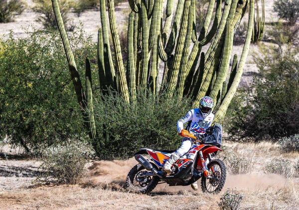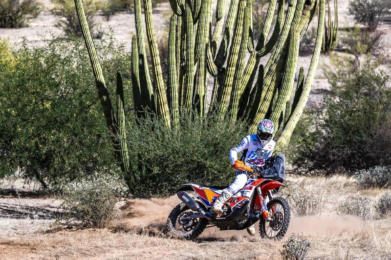 Prima Tappa. Hermosillo-Hermosillo, 170 chilometri di Speciale. Poco da navigare, molto da guidare, qualche rischio sui terreni molto accidentati e trappole varie. Anche in questo caso sorprese e… certezze. Toby Price commette un errore di navigazione che costa all’australiano poco meno di dieci minuti. Vince un outsider velocissimo, Tosha Shareina, Honda, che si impone su Daniel Sanders, GasGas, Pablo “Quintafondo” Quintanilla, Honda, e Matthias Walkner, KTM. Van Beveren, Honda, Sunderland, GasGas, tornato a correre dopo gli infortuni di inizio stagione, Howes, Husqvarna, Branch, Hero, sono tutti infila, non distanti. Indietro Cox, che paga il ruolo di apripista, Klein, calmato dopo l’exploit esplosivo della Dakar, Kevin Benavides.
