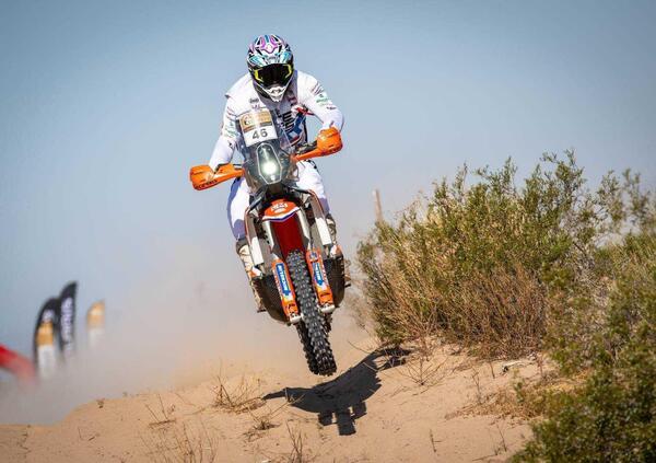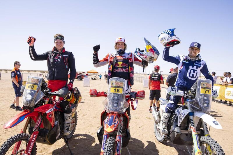 Nella gara delle Moto hanno funzionato due cose: bene la formula dei “Bonus Apripista” introdotta dal Campionato del Mondo Rally-Raid by ASO, e benissimo Daniel Sanders, Pilota da un po’ in credito con la fortuna. Un po’ meno bene road book e percorsi, poca navigazione e molti pericoli. L’australiano ufficiale GasGas è partito forte e, soprattutto, ha mantenuto e imposto un ritmo insostenibile sull’intero arco della gara fatta eccezione la penultima tappa, che gli serviva per offrirsi un finale pirotecnico. Dopo il risultato a sorpresa del prologo, vinto dal figlio d’arte Bradley Cox, e l’altrettanto sorprendente vittoria di Tosha Shareina, Honda, di un soffio nella prima Tappa, Sanders ha vinto la seconda e, nonostante il duro compito di aprire la pista, la successiva terza Tappa, grazie anche, appunto, ai bonus accumulati. Lasciata la quarta a Toby Price, KTM, Sanders ha quindi concluso con la vittoria da manuale della quinta e ultima frazione, aggiudicandosi l’intera posta. Dietro al vincitore Sanders, l’ottimo e ormai più che promettente Shareina, secondo e staccato di quasi 8 minuti e mezzo e, terzo assoluto, l’argentino Luciano Benavides, Husqvarna, come all’Abu Dhabi poco appariscente ma estremamente costante e redditizio.