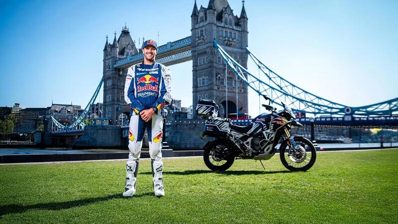 Hinckley, UK, 11 Luglio 2024. Sam Sunderland, 36 anni, di Poole, Inghilterra, non è nuovo agli exploit. A parte le Dakar, 11 partecipazioni e due vittorie, Sud America 2017 e Arabia saudita 2022, lo abbiamo visto in cima al Burj Khalifa, l’edificio più alto del Mondo, volare giù da un aereo con il paracadute, correre in moto contro un jet o una supercar, o sotto l’acquario di Dubai, di nuovo alla Dakar in auto con l’amico e ex compagno di Squadra Toby Price. Ritirato dalle scene del Rally-Raid in anno fa, a febbraio 2025 Sam è diventato ambasciatore, testimonial, uomo d’azione Triumph. Sebbene si faccia fatica immaginarlo lontano dallo sviluppo di una Triumph per la Dakar, uno dei suoi “compiti” è partecipare ad alcuni eventi con le grosse Enduro della Casa di Hinckley. E naturalmente non poteva essere solo “lavoro d’ufficio”, eccheccavolo, vi pare?