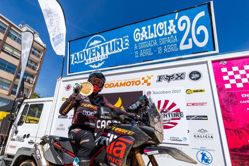 A vincere è Jacopo Cerutti, che di fatto domina il Rally dall’inizio alla fine. Sei tappe, sei podi. Al posto d’onore, assoluto e di classe, Thomas Marini, il talento neo “recluta” 2026 della Squadra. Del resto il clamore deve essere almeno in parte ridimensionato. Non è né strano né inedito che la formazione Aprilia scenda in campo e vinca, subito, d’acchito. Succede con frequenza costante ed è successo al Motorally, al Raid-TT, all’Africa Eco Race, in Turchia e non ricordo dove. Il debutto vincente al Galicia Rally, prima del Campionato, non fa eccezione, dunque, e semmai il clamore non dirada se si pensa che a vincere sia la Tuareg 660 Rally, ovvero una bicilindrica che si permette di battere le più agili e specialistiche monocilindriche altrimenti dominanti sulla scena del Rally-Raid per cui sono nate.