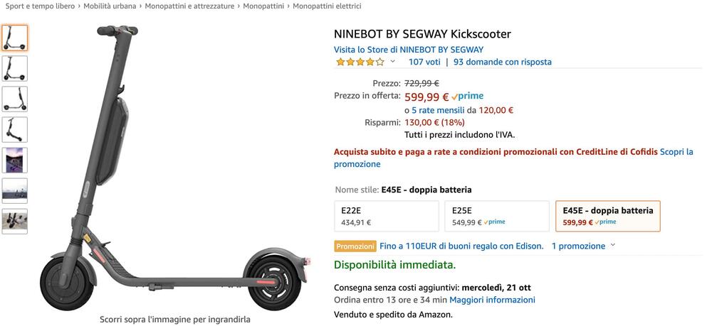 Il Ninebot - Segway E45E con doppia batteria è in offerta ad un prezzo di 599 invece che di 729 con un risparmio netto di 130 euro. Oltre all'affidabilità e alla qualità che il marchio garantisce in questo caso il pacchetto comprende la doppia batteria. Un vero affare per chi fa davvero tanti km sul monopattino.