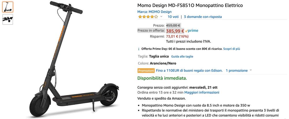 Monopattino Momo Design con ruote da 8.5 inch e motore da 350 w. Ha 3 livelli di velocità (6 km/h, 20 km/h e 25 km/h) e ha luci anteriori e posteriori a LED. Il prezzo, in offerta, è di 385,99 € invece che di 459 €.
