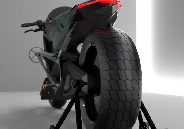 Non è chiaro invece lo schema della trasmissione, apparentemente non a catena ma con una soluzione che potrebbe supportare una trazione integrale su ruote senza mozzo sullo schema delle Sbarro degli anni 80, con tanto di freni a disco perimetrali. La proposta è naturalmente del tutto campata in aria, ma ammettiamo di riconoscerle un certo fascino. Realizzabilità? Ovviamente poco più che nulla.