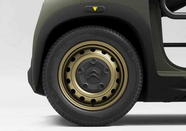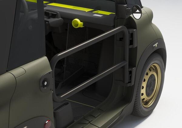 La natura off-road della Ami Buggy più che da dotazioni particolari si distingue da diversi particolari. Ovviamente la prima caratteristica che salta agli occhi è la vernice color Khaki. La carrozzeria poi ha paraurti rinforzi e mascherine per i fari. I parafanghi sono più larghi e coprono ruote con cerchi color oro da 14". Spariscono le portiere e anche il tetto sostituite da tubi protettivi e tettuccio apribile, o meglio... arrotolabile.