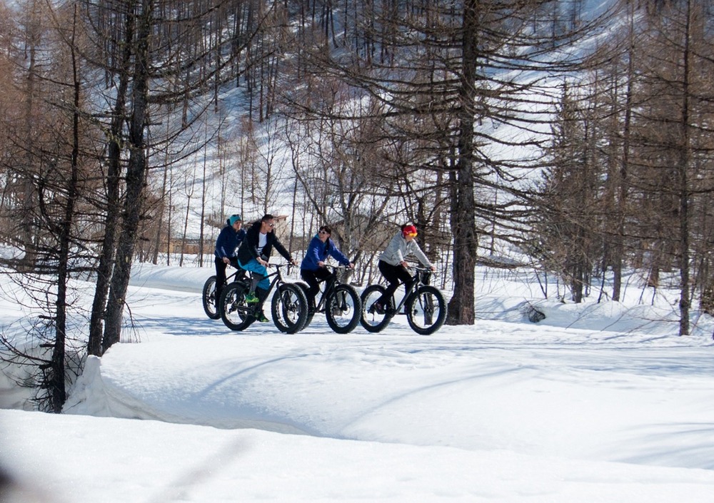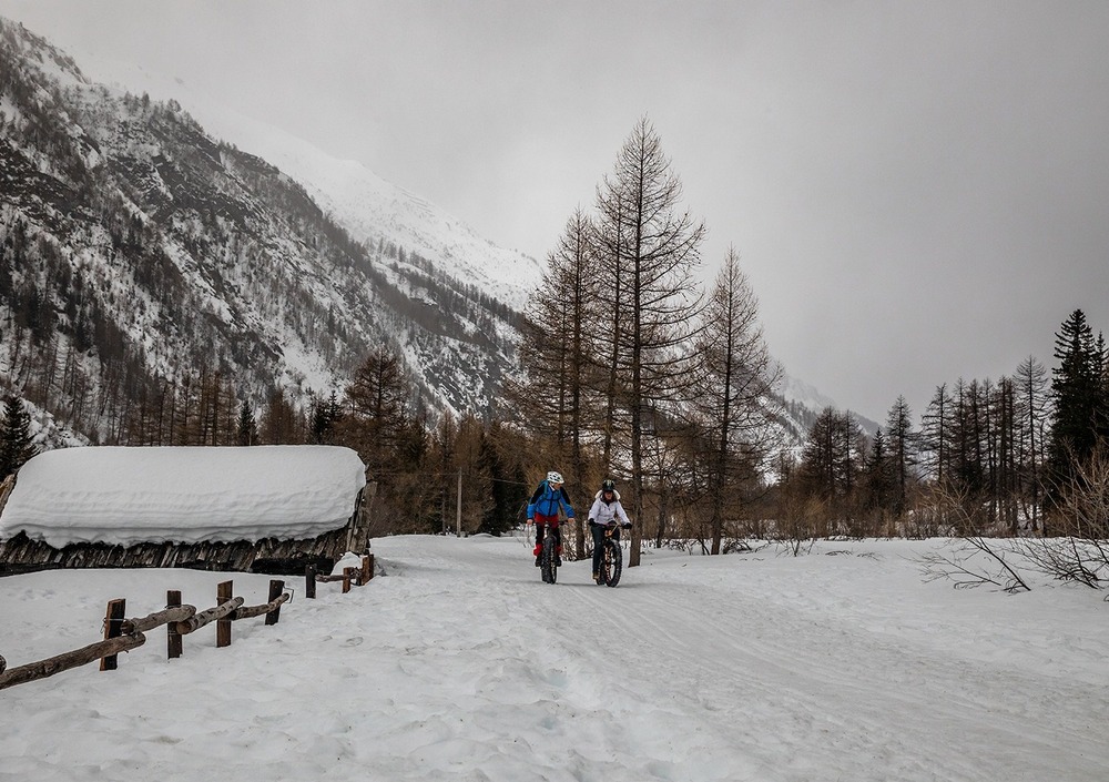 In questi ultimi giorni d’inverno abbiamo avuto l’occasione di testare personalmente l’itinerario più turistico per eccellenza. Partendo da Planpincieux è infatti possibile spingersi fino al Rifugio Elena, che si affaccia sul millenario ghiaccio del Pré de Bard, costeggiando il massiccio del Monte Bianco e il confine italo-francese, e arrivando a lambire il confine svizzero, oppure pedalare lungo il sentiero che si sviluppa lungo l'Alta Via n° 1 della Valle d'Aosta: la famosa balconata della Val Ferret, che unisce il Rifugio Bonatti al Rifugio Bertone e si affaccia sui ghiacciai delle Grandes Jorasses. Possiamo garantirvi che ci penserà il paesaggio a togliervi il fiato, e che poterselo godere in sella ad una bici elettrica fa apprezzare ancora di più lo straordinario panorama. Si può scegliere anche di pedalare su una fatbike, mountain bike dotate di pneumatici extra-size, che sulla neve sono il mezzo ideale perché assicurano una grande stabilità e una notevole facilità di controllo.