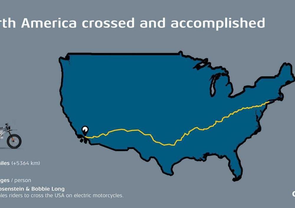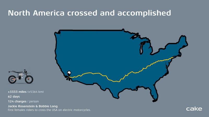 Torniamo ancora una volta a parlare della Cake perché nell'azienda svedese a quanto pare si è diffuso "il virus dell'avventura"! Dopo la traversata da Barcellona a Città del Capo da parte di Sinje Gottwald in sella ad una Kalk, nella bacheca aziendale possono appendere la traversata di un altro continente da est ad ovest. Jackie Rosenstein, direttrice delle vendite di Cake Us, supportata dall'amica Bobbie Long ha guidato un'altra Kalk da una costa all'altra degli States stabilendo un nuovo primato. Partite da New York hanno percorso la storica Route 66 terminando la loro corsa a zero emissioni a Los Angeles, a Marina Del Ray aggiungendo un altro tassello a quello che in Cake ormai chiamano - non senza enfasi - "Electric Conquest of Continents". “La conquista elettrica dei continenti non consiste solo nel dimostrare le capacità delle nostre motociclette elettriche" - ha affermato Stefen Ytterborn, fondatore e CEO di Cake - "La spedizione le ha portate attraverso una varietà di paesaggi e climi, spingendo oltre i limiti delle motociclette elettriche CAKE e dimostrando la dedizione del marchio alla tecnologia pioneristica e all'eco-compatibilità. Jackie Rosenstein e Bobbie Long, due appassionate amanti delle motociclette, hanno intrapreso un'impresa incredibile: diventare la prima coppia femminile a guidare motociclette elettriche in tutto il Nord America. Siamo onorati che Jackie e Bobbie, seguendo le orme di Sinje, abbiano affrontato questa formidabile sfida e siano di ispirazione per molti altri".