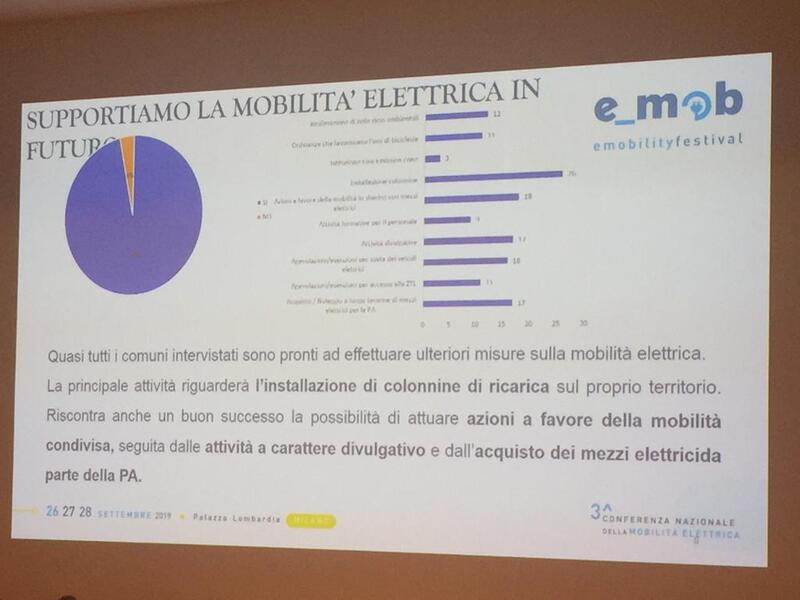 Le attività messe in campo dalle amministrazioni per favorire la mobilità sostenibile si sono concentrate principalmente sull'istallazione di colonnine di ricarica, sulla realizzazione di ciclabili, sull'incentivazione dello sharing e sull'acquisto di veicoli elettrici per la PA. I numeri sono ancora bassi su tutti i fronti però: il numero di colonnine di ricarica per esempio nel 34% dei Cumuni intervistati rientra nella facia 1-5. Per quanto riguarda lo sharing il 59% degli intervistati ha attivato almeno un servizio sul territorio. L'azione più gettonata riguarda il bike sharing seguito dal car sharing. Gli aspetti individuati come principalmente critici sono: la percezione di tempi di ricarica, la mancanza di colonnine e il costo dei mezzi.