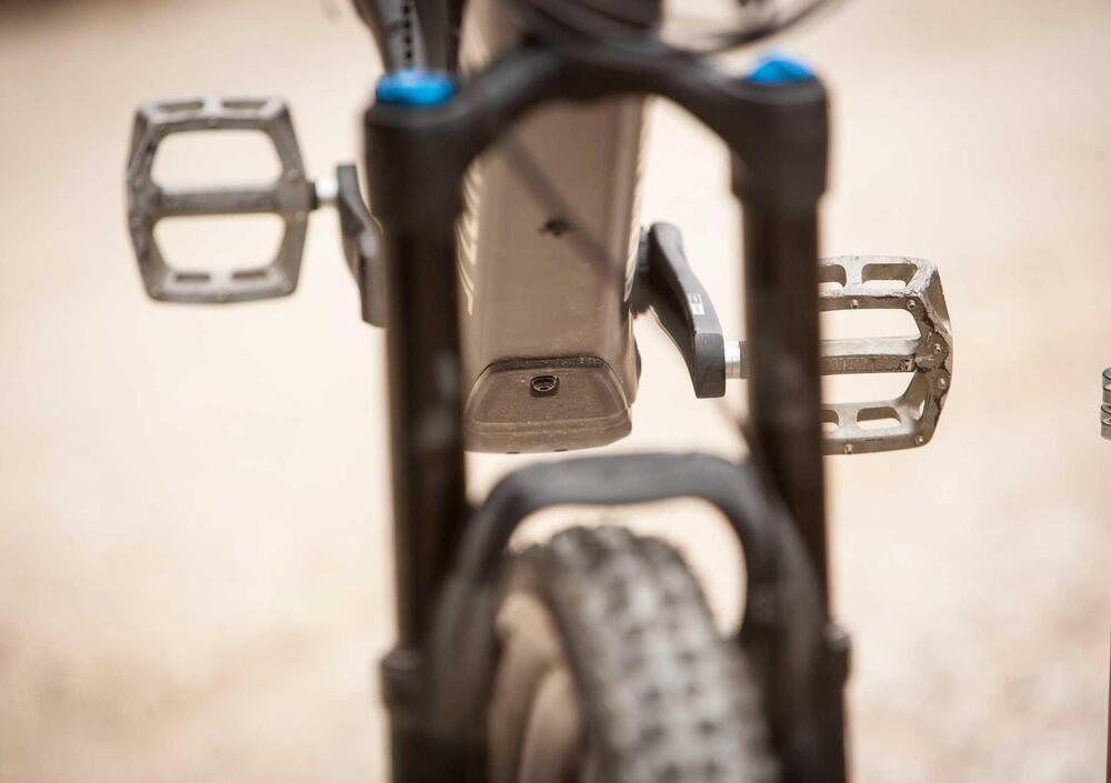 Con sentieri fluidi questa bici vola, è così precisa che non sembra una bici in carbonio di livello base. I componenti non sono di prima classe, ma funzionano tanto bene insieme che la bici ci ha sorpreso come un'unità completa. In discesa ci siamo trovati al comando della bici, che si inseriva nelle curve molto più tardi di quanto sia possibile con una e-bike pesante. Piccoli salti, discese e radici, la bici seguiva il ciclista e non viceversa. Tutte le sensazioni di una bici non elettrica. Sui sentieri più accidentati si raggiungono i limiti della sospensione posteriore mentre la forcella Fox da 36" è molto capace e offre un'ottima tracciabilità. La configurazione delle ruote mullet è la nostra preferita su questa bici, con i freni che si distinguono per la leggerezza, offrendo una frenata reattiva e meno peso lanciato in avanti sui sentieri ripidi.