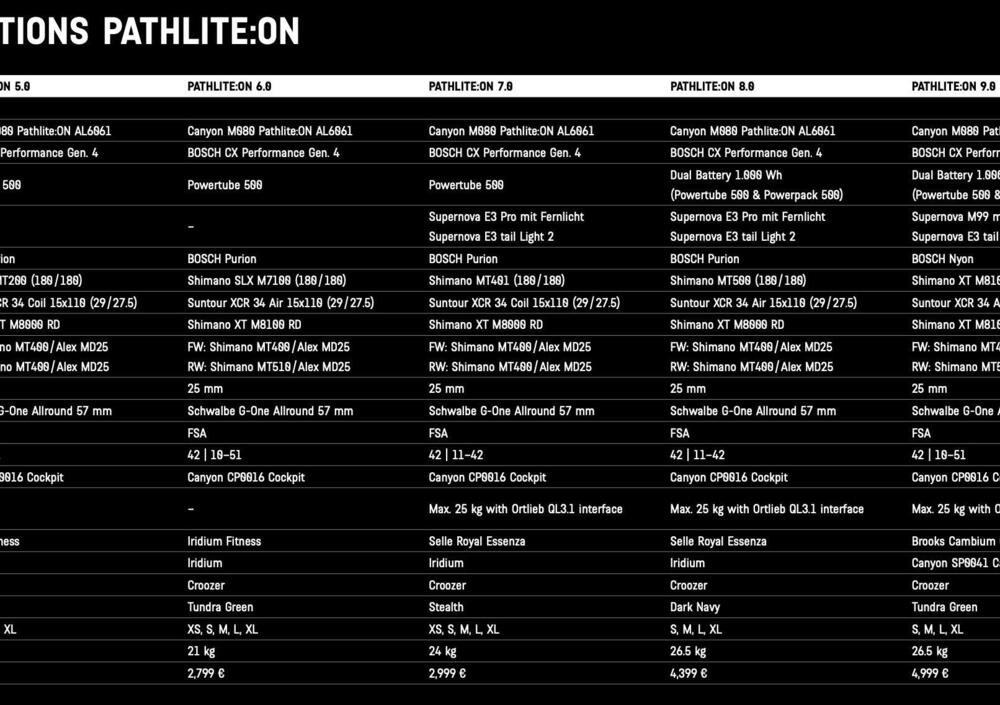 La Pathlite:ON è disponibile in 5 allestimenti con prezzi compresi tra €2.499 e 4.999 (validi per l’Eurozona) in altrettante taglie dalla XS alla XL. Scopri tutte le caratteristiche della bici su www.canyon.com