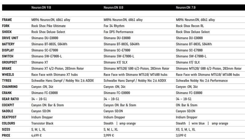 I modelli 2020 della Neuron:ON saranno in vendita dal 10 marzo 2020, esclusivamente su canyon.com. Quattro gli allestimenti disponibili: la Neuron:ON 9.0 (4,499 euro), 8.0 (3,999 euro), 7.0 e WMN 7.0 (entrambe 3,599 euro). L’ammiraglia della gamma è ovviamente la Neuron:ON 9.0, equipaggiata con forcella RockShox Pike Ultimate, ammortizzatore RockShox Deluxe Select, trasmissione e freni Shimano XT e reggisella telescopico Iridium. Tutta la gamma monta inoltre componenti sviluppati da Canyon: la sella SD:ON specifica per eMTB, una nuova accoppiata manubrio / attacco con passaggio cavi interno e una corona anteriore Canyon:ON da 34 denti.