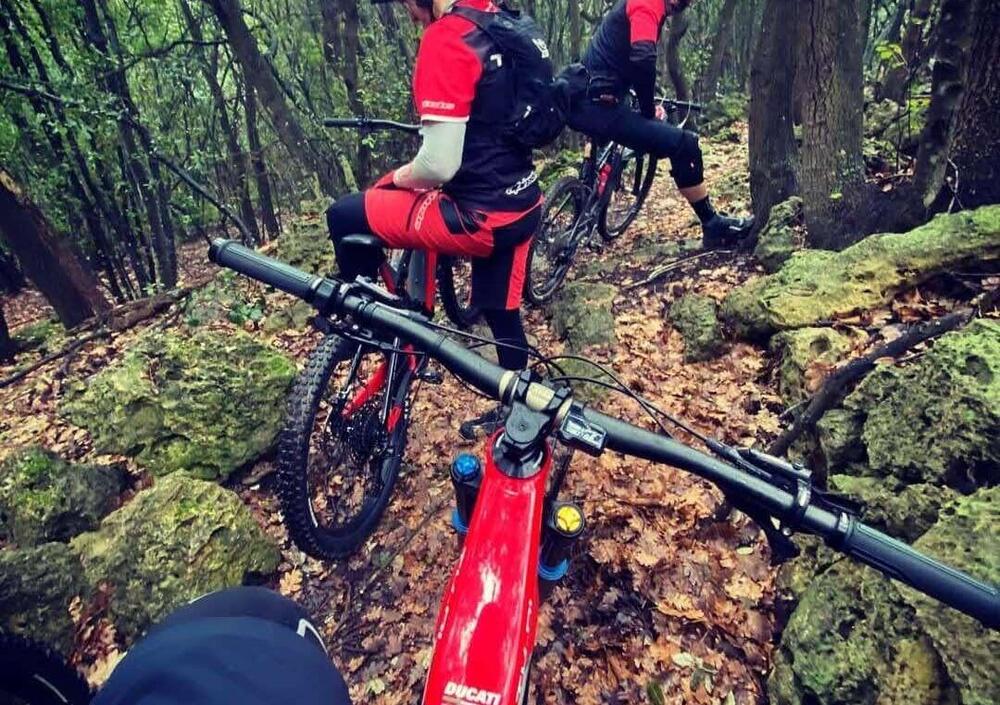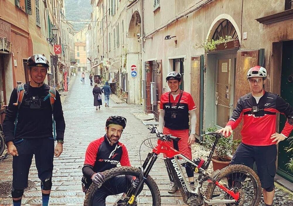 La Ducati Corse TK-01RR è realizzata in collaborazione coi bravissimi tecnici e ingegneri di Thok (leggi la nostra visita in azienda con la prova della TK-01). E proprio con loro abbiamo fatto un enduro hard test sui percorsi di Finale Ligure. I campioni Stefano Migliorini e Stefano Rota ci hanno accompagnato su trail tecnici per mettere alla frusta le doti del telaio e delle sospensioni da 180/170 mm, delle gomme Pirelli, dei freni Shimano e del nuovo motore Ep8 con tre modalità di erogazione (Eco, Trail e Boost, mappabili da app).