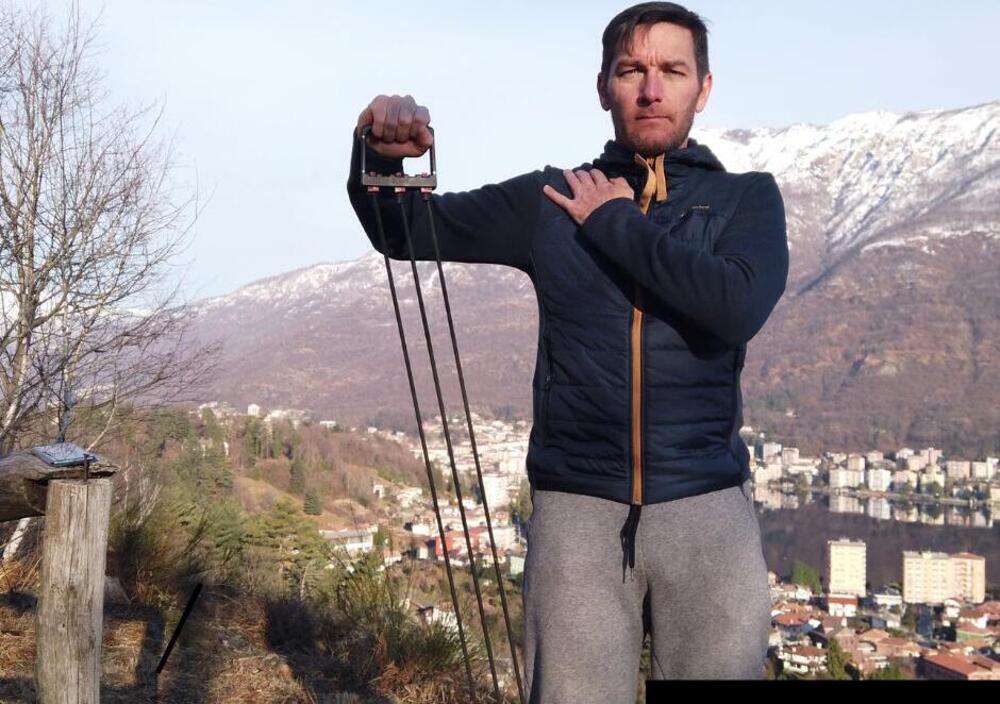 Le alzate laterali e i bicipiti con gli elastici sono due esercizi da realizzare in abbinata, che hanno la funzione di stabilizzare la spalla durante la guida, rendendo così più facile il controllo del manubrio.