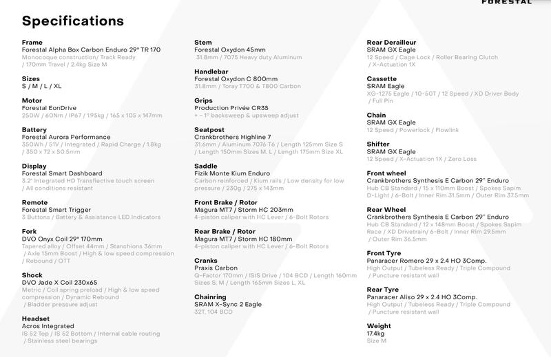Il motore è un'esclusiva di Forestal. Una cosa sorprendente anche se no nè il primo brand a farlo. L'unità è stata chiamata Eon Drive, è realizzata in titanio e magnesio e studiata per restituire alla pedalata una sensazione di assoluta naturalezza. Forestal assicura che è l'esperienza più vicina alla muscolare ora disponibile. Il motore da 250 w ha 60 Nm di coppia è alimentato da una batteria da 350wh, integrata nel telaio e non rimovibile. Forestal ha optato per una tecnologia di ricarica rapida in modo da poter ricaricare all'80% in 1h 24 minuti. Opzionale c'è anche un range extender. Il motore EON è stato realizzato in collaborazione con Bafang, che è citato come uno dei principali fornitori asiatici di sistemi di trasmissione elettrica.