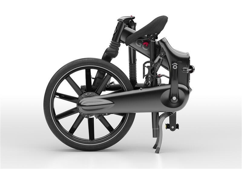 Come abbiamo già scritto, in tutta la bici non c'è un solo cavo a vista. Questo dettaglio da solo facilita molto l'operazione. Basta sbloccare due ganci per ripiegarla e ridurla alle dimensioni di un trolley. Se la si vuole ulteriormente compattare si può sfilare il tubo reggisella e riporlo in un apposito spazio tra le due ruote. L'operazione è molto facile anche grazie al piccolo doppio cavalletto che scarica il peso della bici e non ci costringe a complicati equilibrismi. In alcuni modelli di GoCycle (non nel nostro) le ruote sono dotate del sistema di sgancio rapido che consente di ridurre ulteriormente gli ingombri.