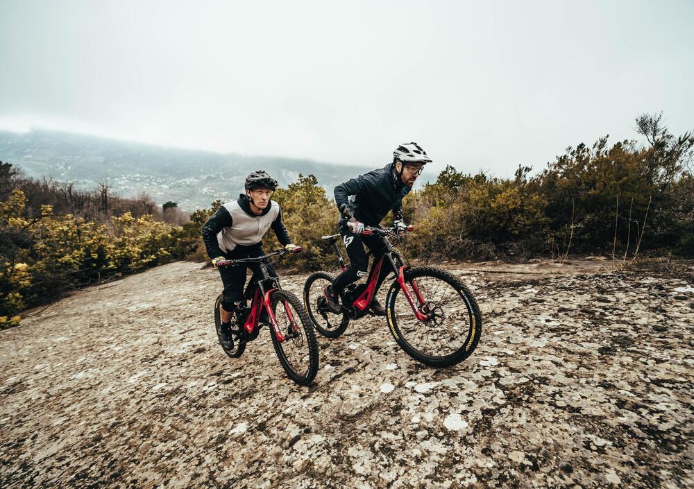 Nico ha utilizzato spesso la modalità turbo ,e andava molto velocemente: seguirlo sulla GLP2 è stato estremamente impegnativo. Tuttavia questa esperienza è stata ottima per cercare di spingere la bici fino al limite. La trazione in salita è eccezionale, e si ha la possibilità di passare sopra le rocce, andare per salite particolarmente ripide e curvare meglio rispetto a qualsiasi altra eBike che abbiamo provato. L’ottima distribuzione del peso significa che la parte anteriore sembra molto leggera, ma allo stesso tempo non eccessiva: ovviamente questo garantisce un ottimo controllo del mezzo il cambio di direzione in salita lo si affronta semplicemente, così come lo stallo sulle salite più rognose. Abbiamo trovato le sospensioni sufficientemente reattive quando si pedala in salita e il set up suggerito da Nico è estremamente valido.