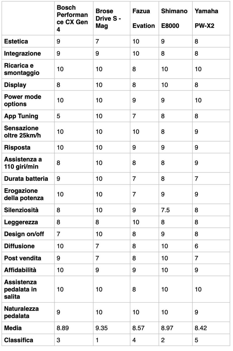 Bosch e Brose offrono due sistemi ottimi, che sono saliti al vertice della nostra personale classifica. Possiamo dire che Brose abbia un piccolo margine di vantaggio, grazie alla possibilità di personalizzazione: ci piace la possibilità di customizzare le bici. Se si guarda all'età dei motori, il fatto che quello offerto da Shimano abbia quattro anni e sia nella parte alta della classifica, significa che il prodotto è di grandissima qualità.
