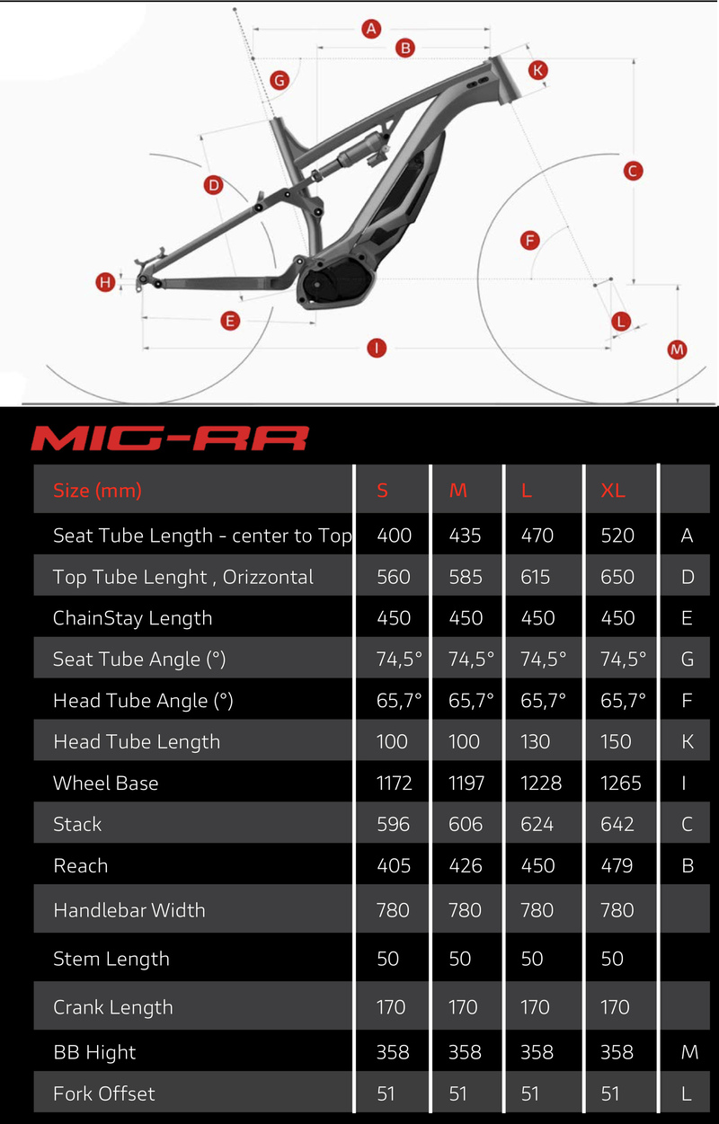 L'uso di una forcella da 170 mm e di una ruota anteriore da 29" si traduce in pura aggressività su un mezzo che è chiaramente pensato per l’Enduro. Il reach da 450 mm (taglia L) e lo stack da 624 mm, trasmettono enorme sicurezza al pilota che non teme alcun ostacolo che gli si presenti sul sentiero. Nell’utilizzo di una bicicletta elettrica anche la salita diventa una parte importante del tracciato, e in questo frangente le geometrie della Mig-RR regalano tanta stabilità e anteriore sempre a terra.