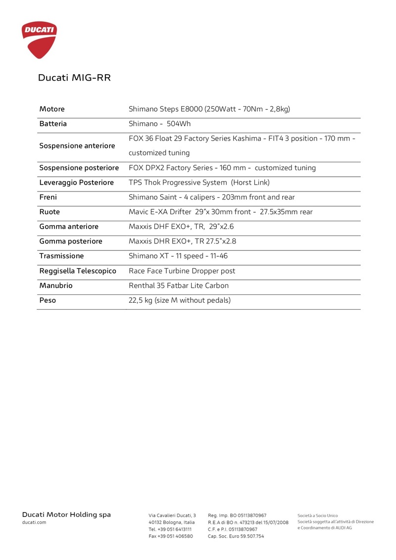 Le sospensioni FOX utilizzate sono le migliori sul mercato. All’anteriore abbiamo una 170 mm abbinata a una ruota da 29” mentre al posteriore l’escursione si ferma a 160 mm, con ruota da 27,5"+. Il telaio della Mig-RR è uno dei migliori in alluminio che si possa trovare in circolazione. E in ultimo: il prezzo, che, nonostante tanta qualità, rimane competitivo rispetto alla concorrenza e offre a Ducati un solido punto di partenza nel mercato delle eBike.